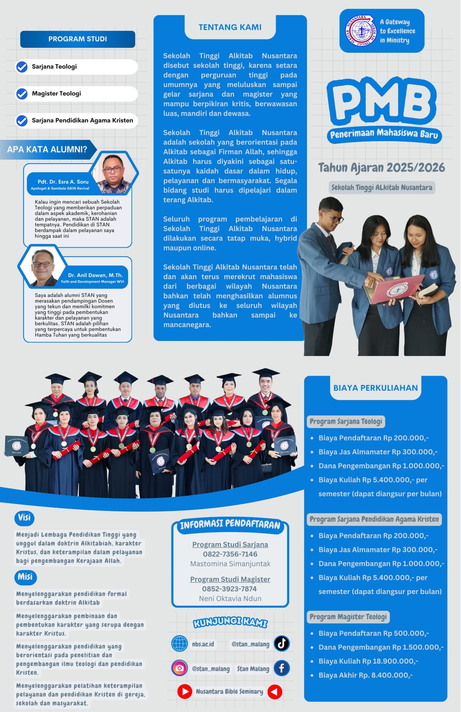 Sekolah Tinggi Alkitab Nusantara (STAN) berdiri atas dukungan Yayasan Pekabaran Injil Nusantara (PINTA), yang bekerja sama dengan OMS Internasional bertempat di Malang, Jawa Timur. STAN berdiri pada bulan Maret 1975, bertempat di Jln. Retawu no. 4 Malang dengan nama PUSAT LATIHAN THEOLOGIA NUSANTARA (PLTN) yang memiliki program kuliah 3 tahun. Kemudian program kuliah ini ditambah 1 tahun untuk tugas praktek.